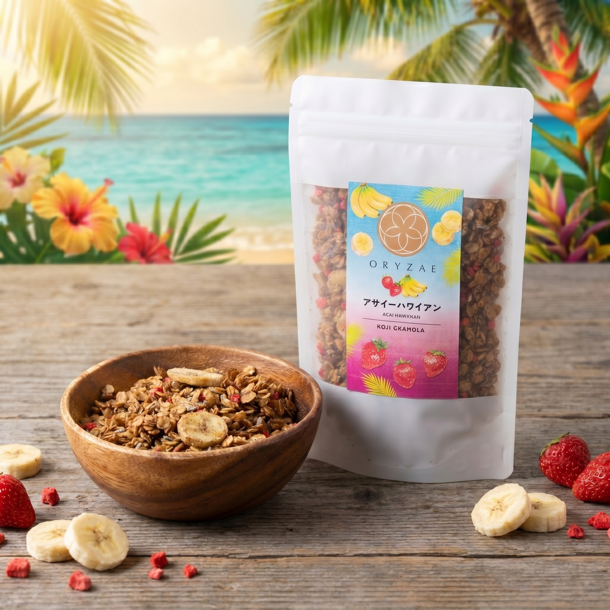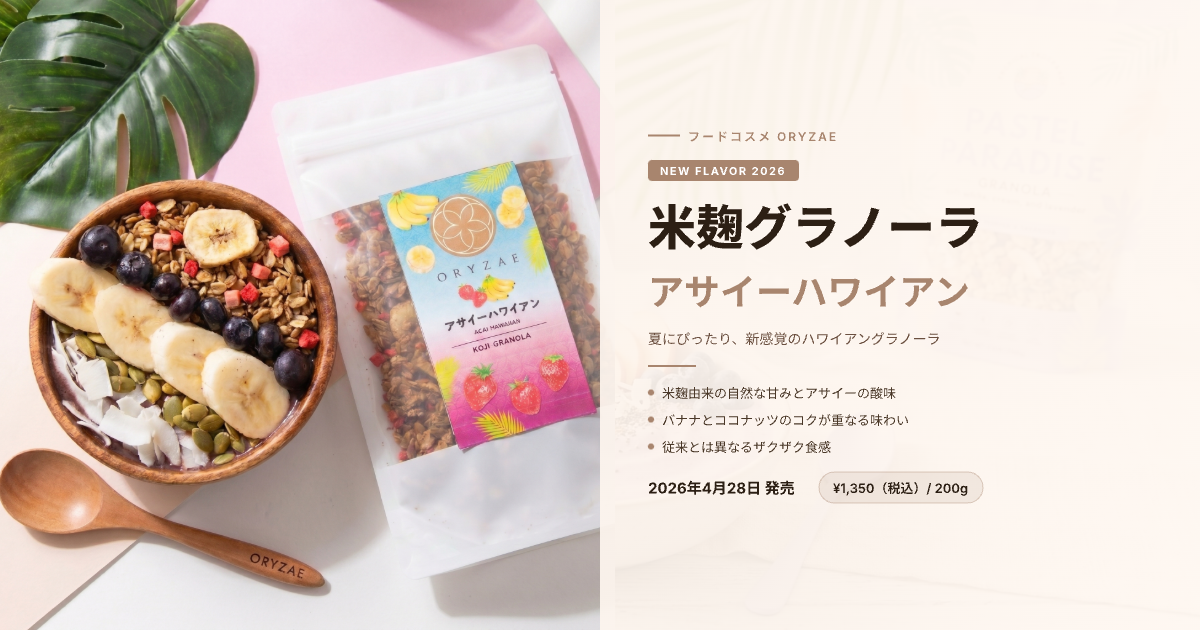 日本の伝統発酵技術を用いて社会課題解決を目指す株式会社オリゼ(本社:東京都渋谷区、代表取締役:小泉泰英)は、米麹グラノーラブランド「フードコスメ ORYZAE」より、新フレーバー『米麹グラノーラ(アサイーハワイアン)』を2026年4月28日(火)17時に発売開始いたします。