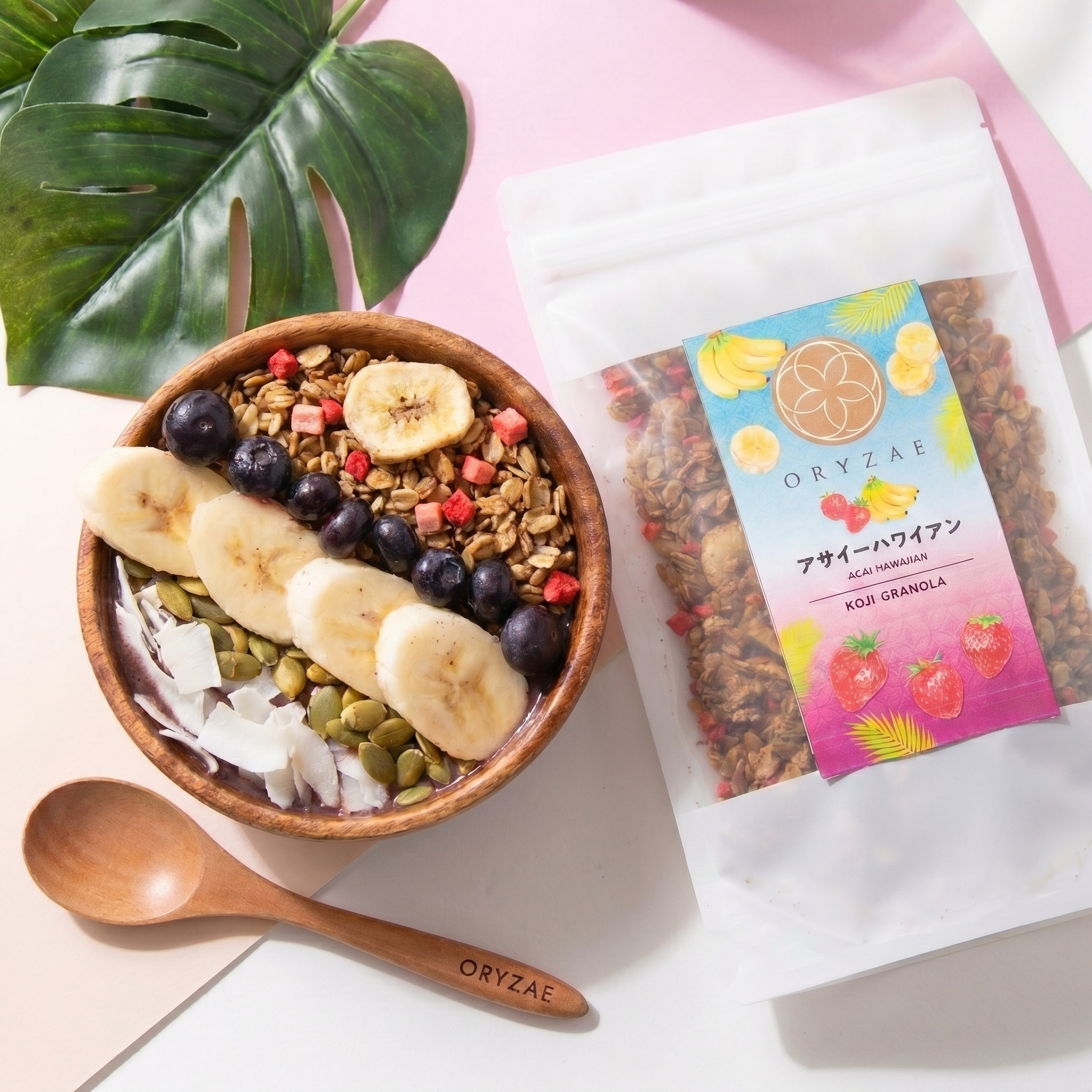 スーパーフード・アサイーをオリゼらしく仕立てた、新感覚のハワイアングラノーラです。米麹由来のやさしい甘みとアサイーの豊かな酸味、バナナとココナッツのコクを重ね、従来のアサイーボウルとは異なる食感で楽しめる一品に仕上げました。