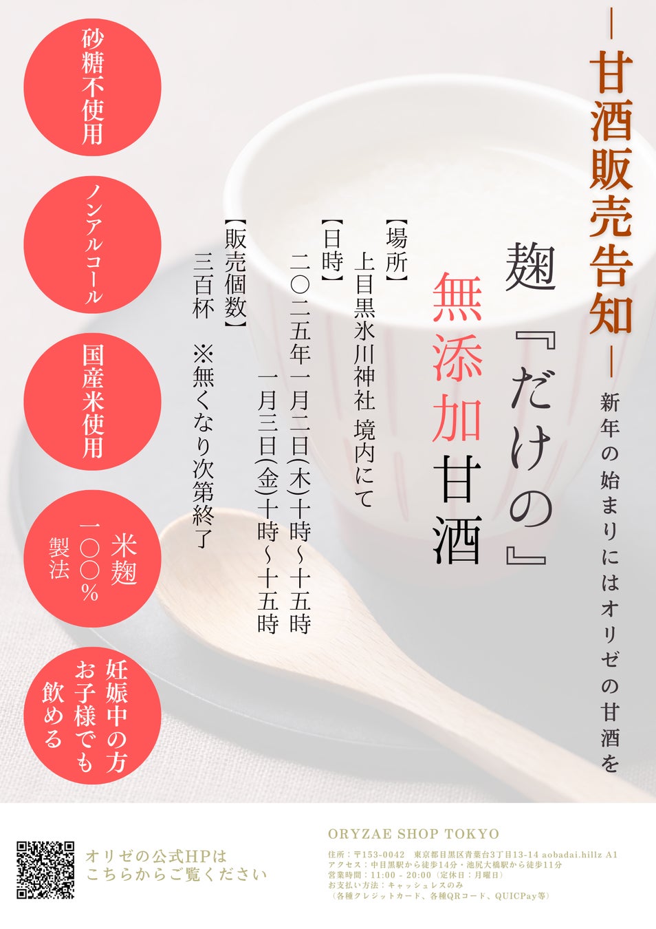 日本の伝統発酵技術を用いて社会課題解決を目指す株式会社オリゼ(本社:東京都渋谷区、代表取締役:小泉泰英)は、発酵食品ブランド「フードコスメORYZAE」で人気の米麹甘酒を、2025年1月2日(木)、3日(金)の2日間、上目黒氷川神社境内(東京都目黒区)にて数量限定で販売いたします。